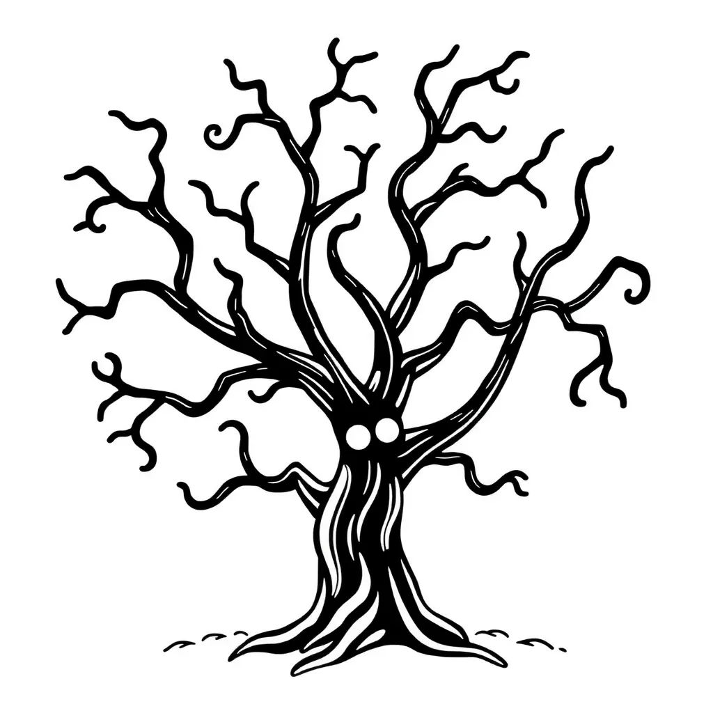 Gruseliger Baum mit verdrehten Ästen und Augen als Ausmalbild in Schwarz-Weiß.