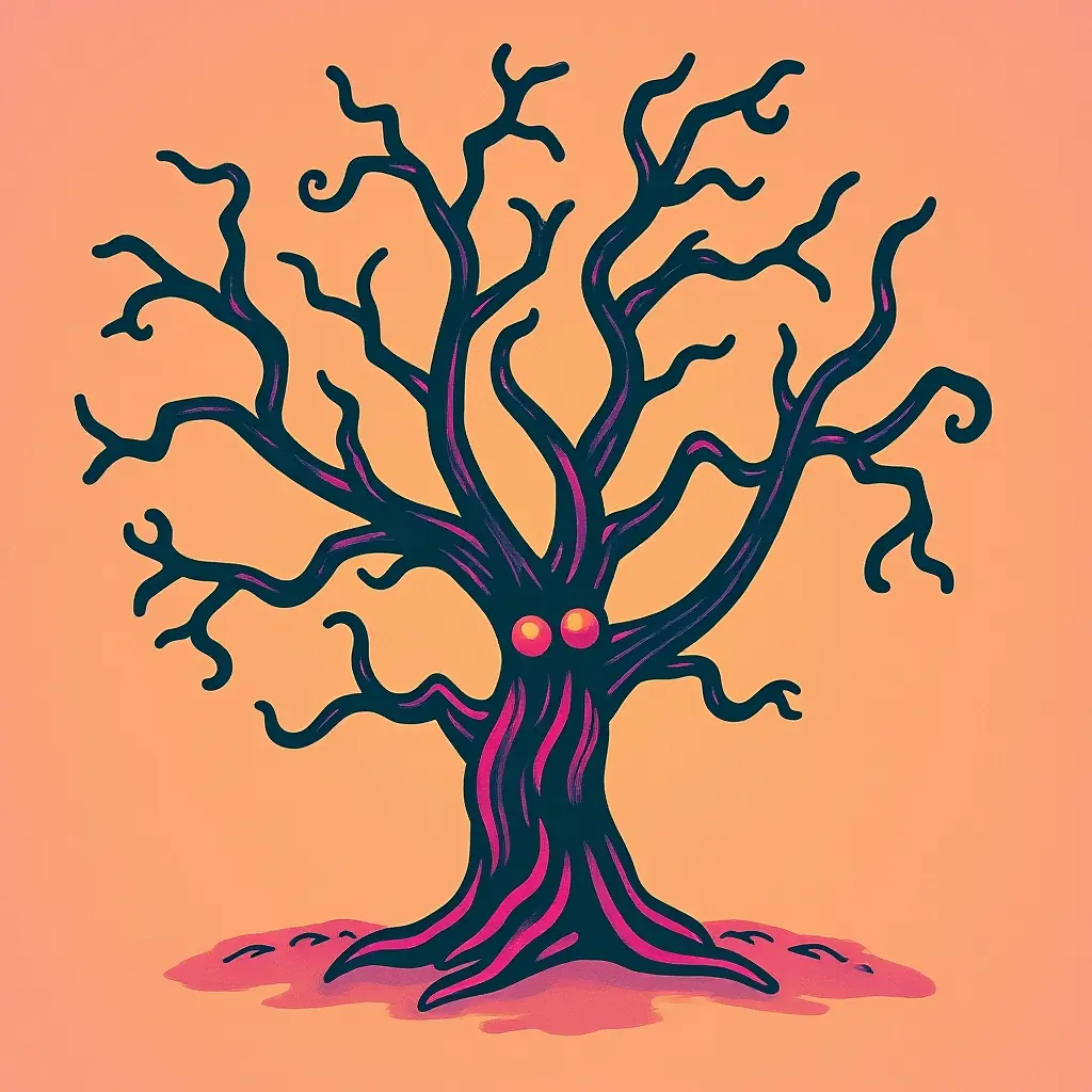 Der Baum scheint von Augen durchzogen zu sein. Kleine, schwarze Punkte, die wie Augen wirken, sind in den Ästen und der Rinde verteilt. Diese Details verleihen dem Bild eine besonders gruselige Atmosphäre, ohne dabei zu überladen zu wirken. Die Augen scheinen einen Blick zu erhaschen, der eine subtile Spannung erzeugt.