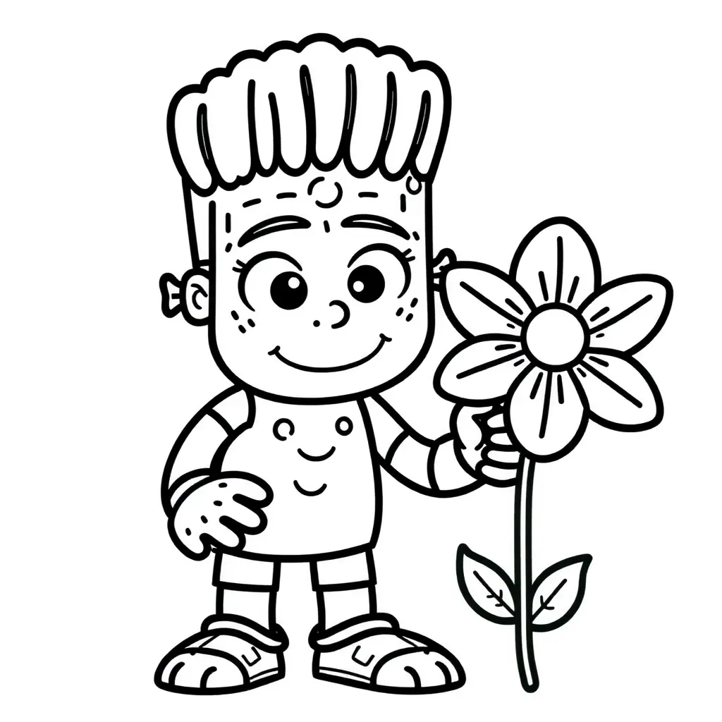 Niedlicher Frankenstein mit Blume in der Hand als Ausmalbild in Schwarz-Weiß.