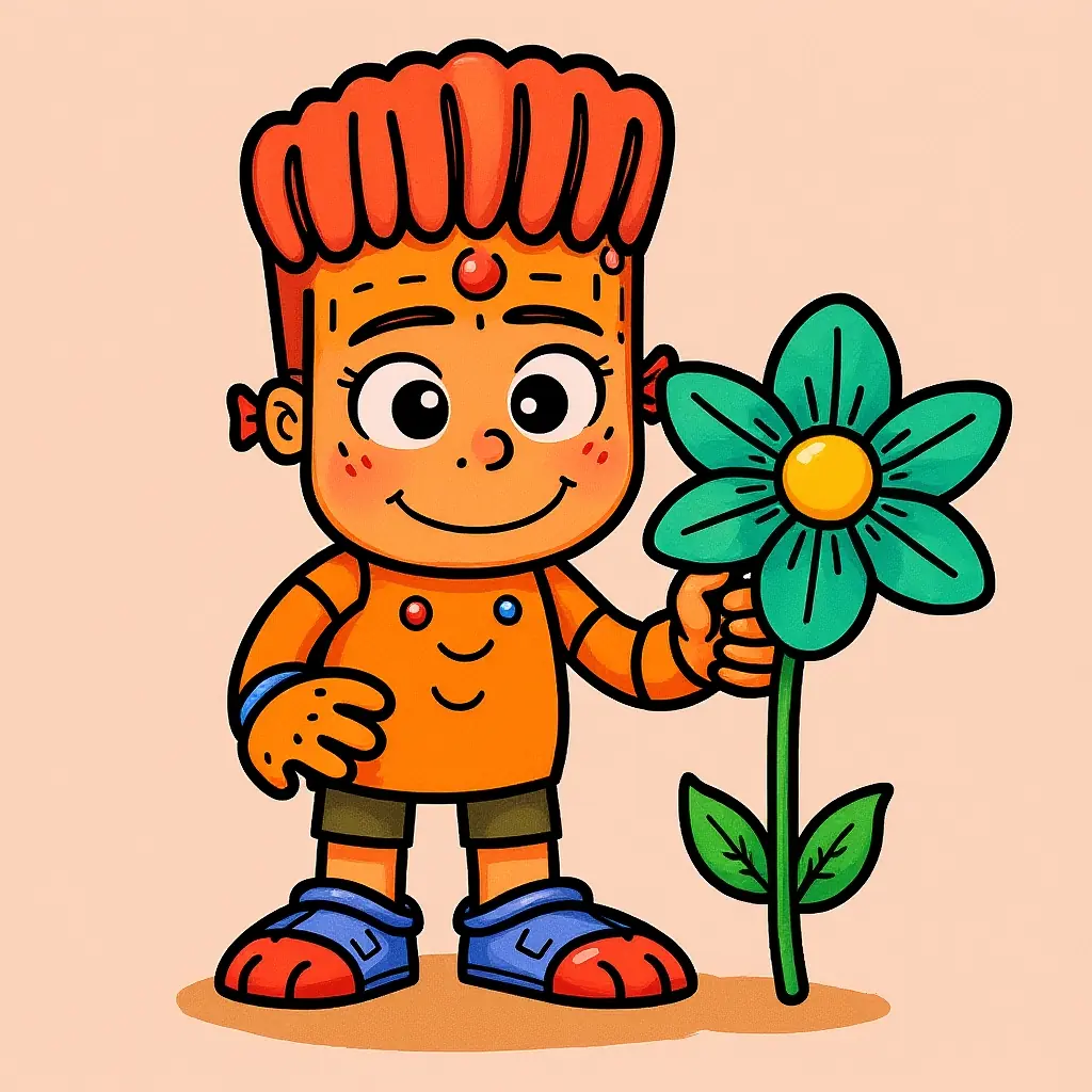 Frankenstein hält in seiner rechten Hand eine einzelne Blume. Die Blume ist ebenfalls in Schwarz und Weiß gehalten und detailreich gemalt, mit einzelnen Blättern und einem einfachen Blütenblatt. Die Blume steht im Kontrast zu dem Monster und trägt zur freundlichen Atmosphäre des Bildes bei.