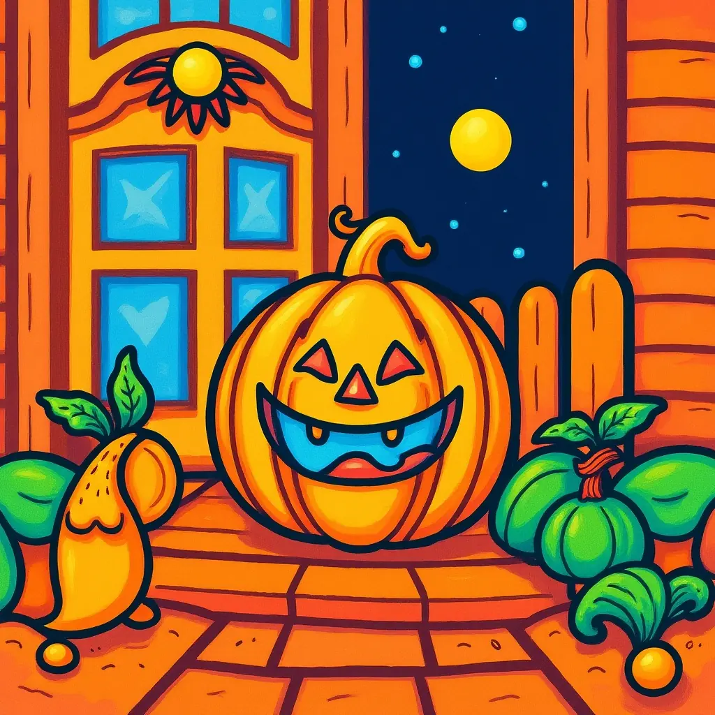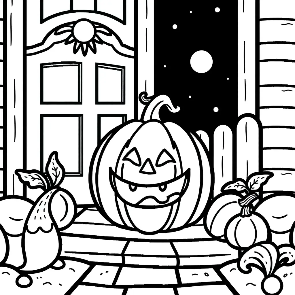 Der Kürbis ist in einem freundlichen, gelächelten Ausdruck dargestellt. Seine Gesichtszüge sind groß und rund, was einen charmanten und einladenden Eindruck erzeugt. Sie sitzt auf einer Türschwelle, was ihr einen praktischen und leicht verständlichen Kontext verleiht.