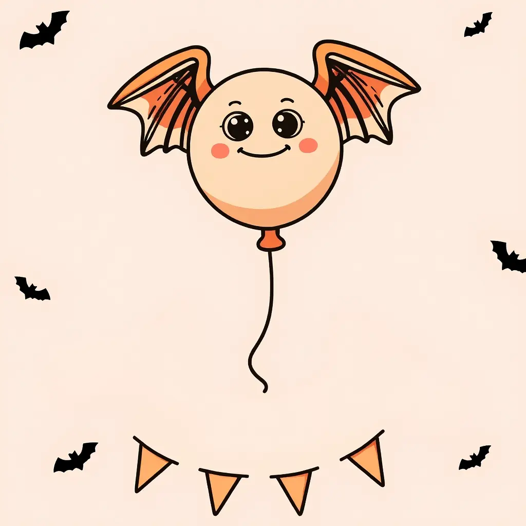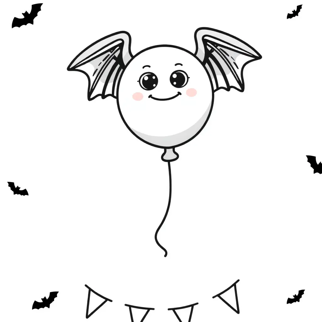 Fledermausförmiger Ballon über einer Halloweenparty als Ausmalbild in Schwarz-Weiß.