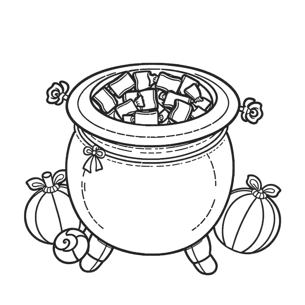 Kessel voller Süßigkeiten statt Zaubertrank als Halloween-Ausmalbild in Schwarz-Weiß.
