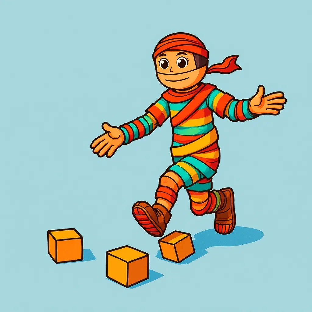 Die Mumie ist in eine Art, wie sie oft dargestellt wird, mit Bandagen oder Wicklungen, dargestellt. Diese sind unregelmäßig über ihren Körper verteilt und scheinen nicht vollständig geschlossen, was dem Bild einen verspielten und etwas chaotischen Charakter verleiht. Sie scheint die Hopscotch-Felder mit Leichtigkeit zu überwinden und dabei scheinbar vor Freude zu strahlen. Die quadratischen Felder sind in verschiedenen Größen gezeichnet und mit klaren Linien hervorgehoben.
