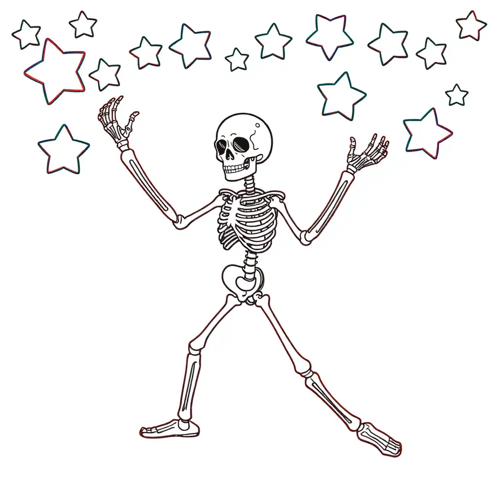 Halloween steht vor der Tür und wir haben die perfekte Aktivität für kleine und große Geister – ein farbenfrohes Ausmalbild, das die besondere Jahreszeit widerspiegelt. Wir präsentieren Ihnen eine detaillierte Darstellung eines Skeletts, das unter einem funkelnden Sternenhimmel tanzt.
