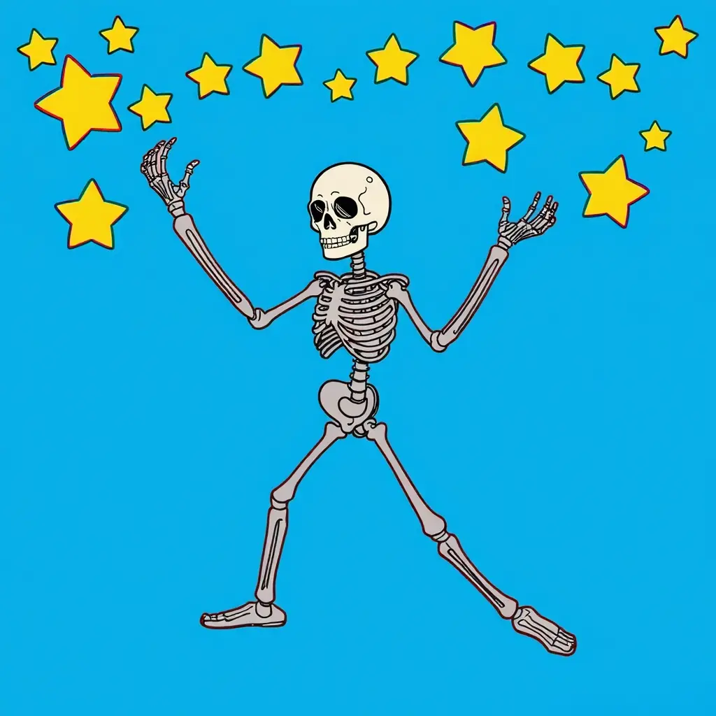 Die Illustration zeigt ein Skelett in einer dynamischen Pose. Es ist in eine schlanke, leicht gebogene Silhouette gezeichnet, als ob es sich in einer verspielten Drehung befindet. Die Gliedmaßen sind leicht gespreizt, die Arme sind leicht nach oben gestreckt, als wolle das Skelett den Sternen nachfolgen. Das Skelett trägt einen weißen Umhang, der locker um den Körper fällt.