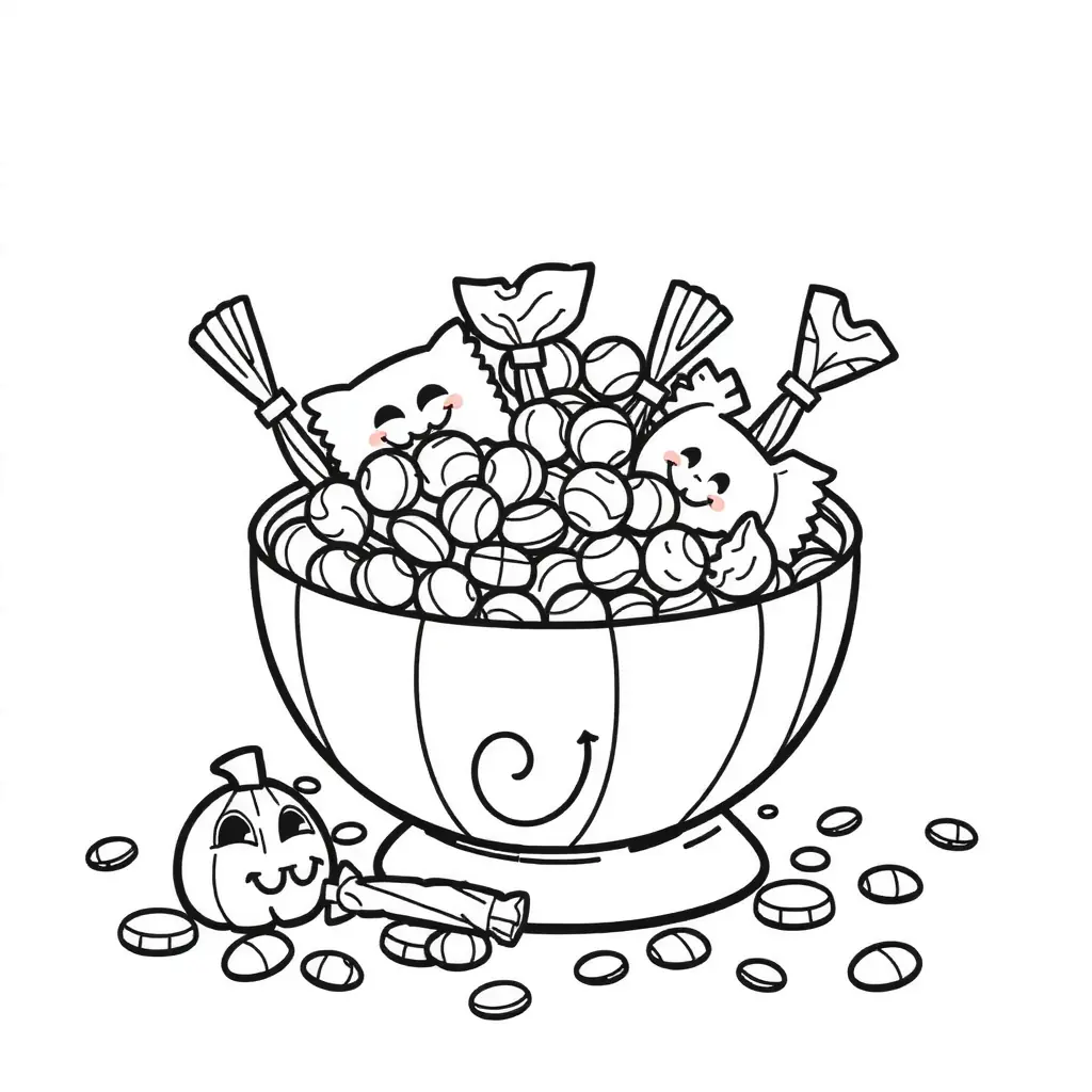 Schüssel voller Halloween-Süßigkeiten als Ausmalbild in Schwarz-Weiß.
