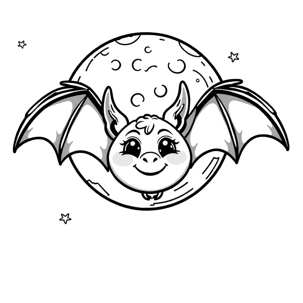 Lächelnde Fledermaus fliegt vor dem Vollmond als Ausmalbild in Schwarz-Weiß.
