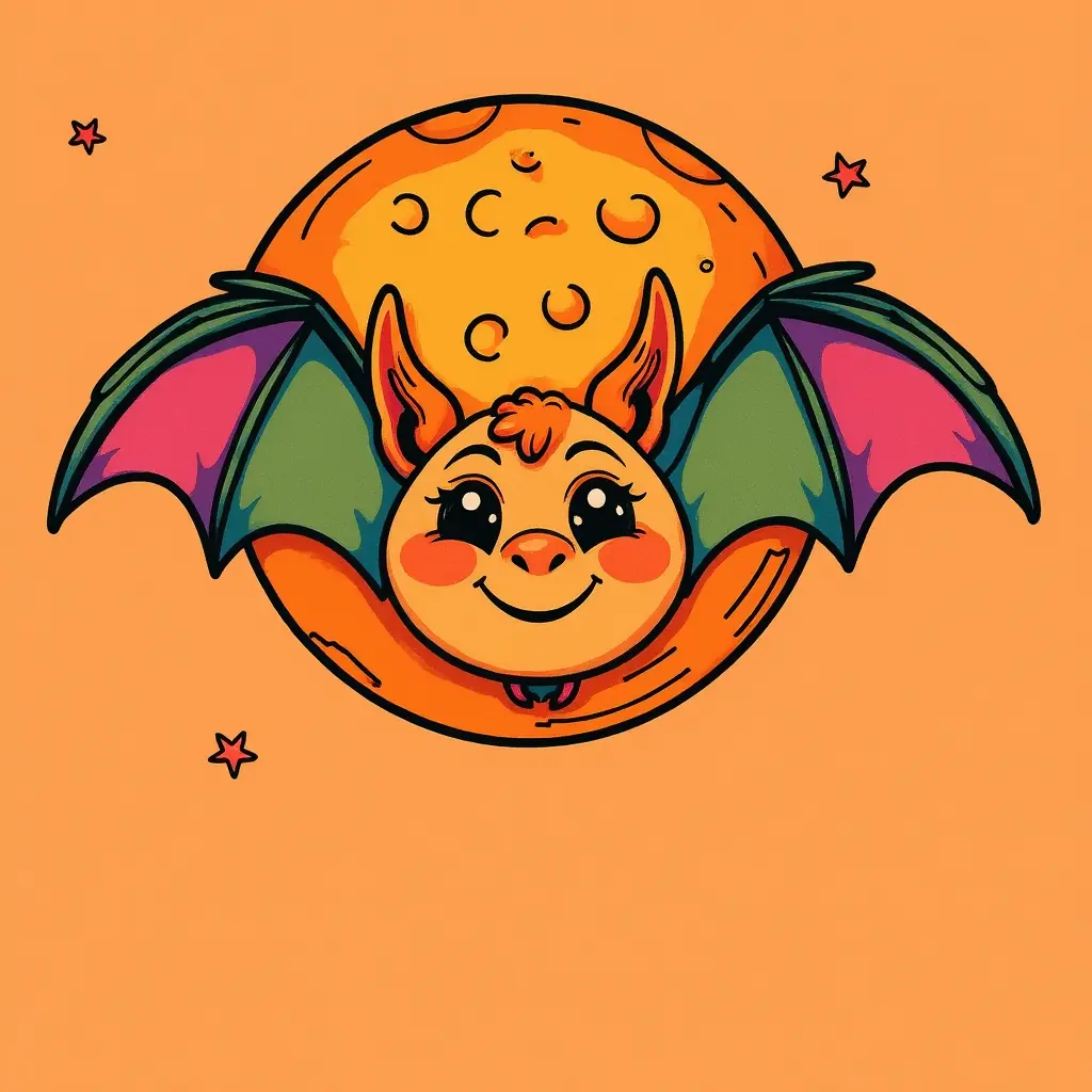 Das Bild zeigt einen freundlichen Fledermaus, der in der Nähe eines vollmondbeschienenen Himmels fliegt. Die Fledermaus ist in ein sanftes, warmes Braun dargestellt und hat ein fröhliches, leicht geöffnetes Maul. Sie wird von einem runden Vollmond umgeben, der in hellem Weiß dargestellt ist. Der Mond dominiert den oberen Teil des Bildes und scheint ein warmes, goldenes Licht auszustrahlen.
