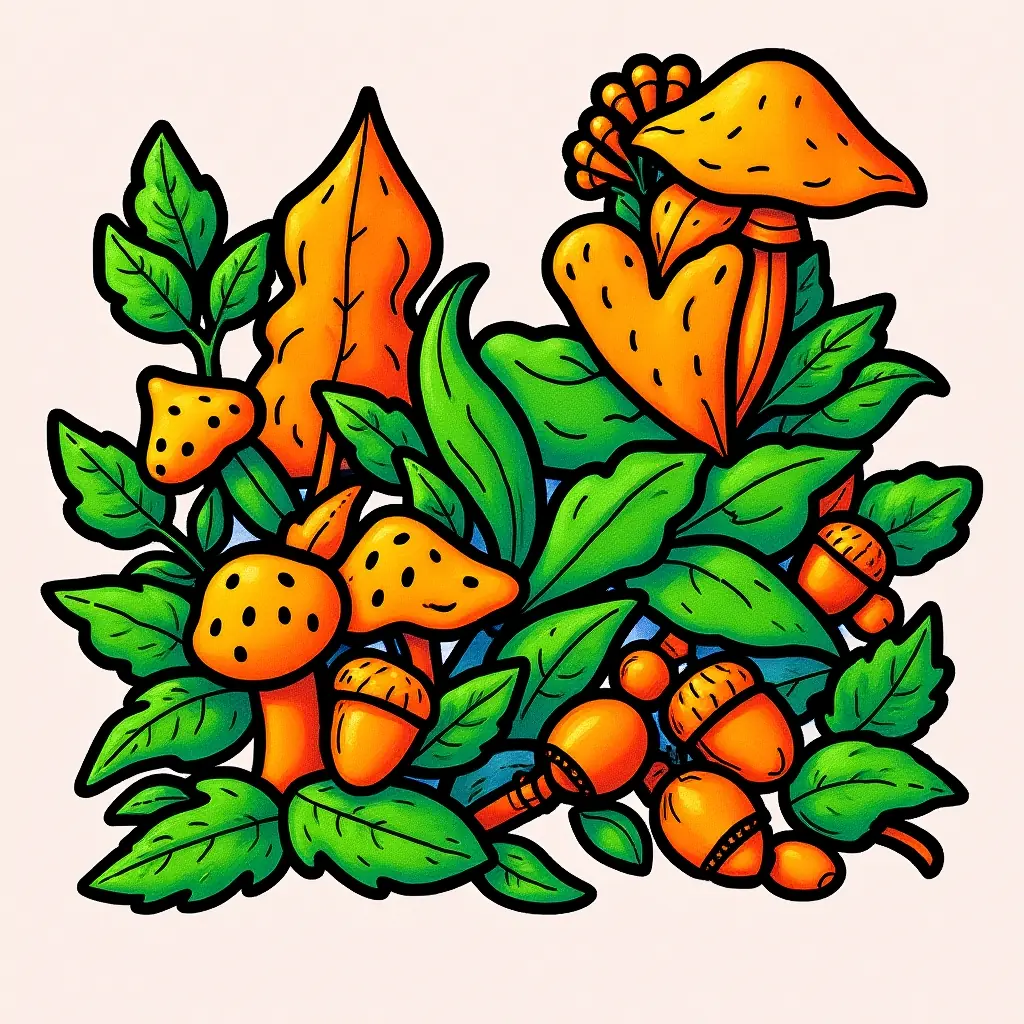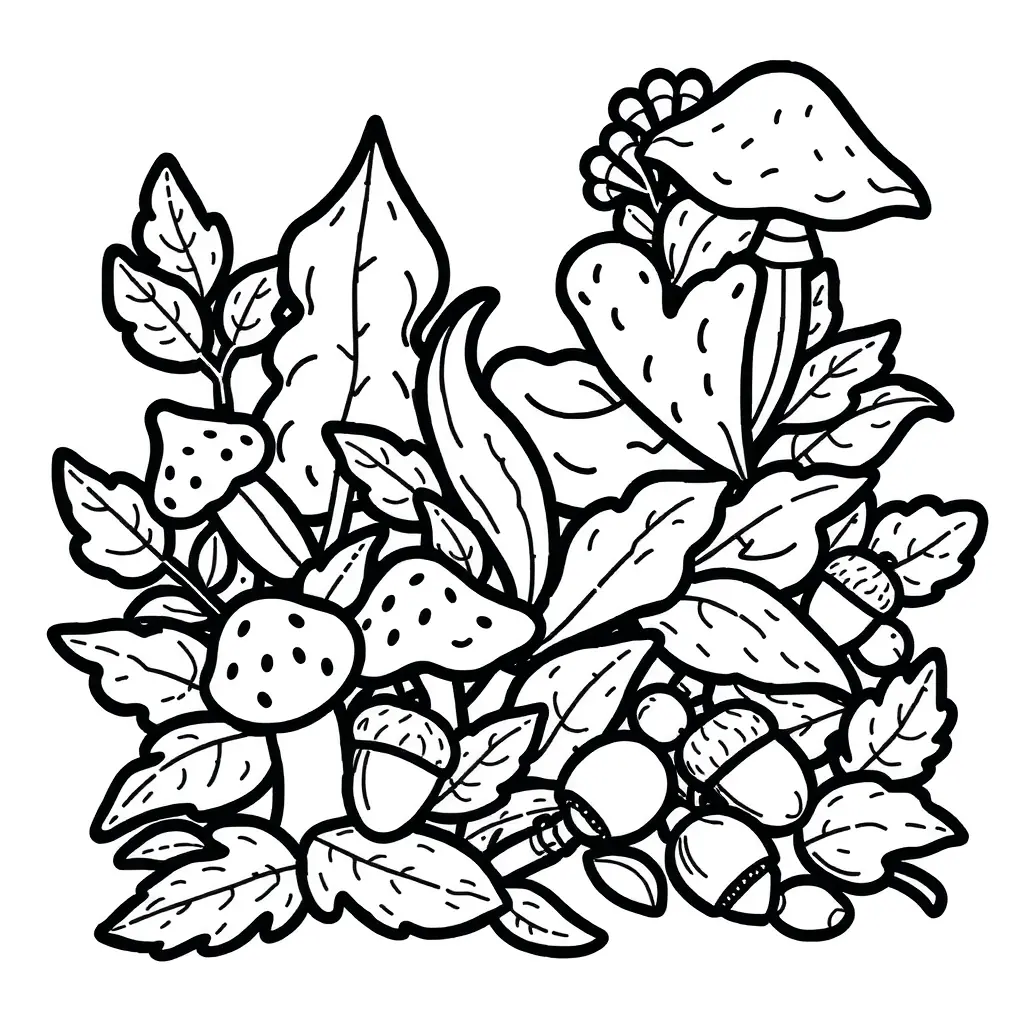 Kostenloses Ausmalbild: Herbstwald mit Pilzen und Eicheln