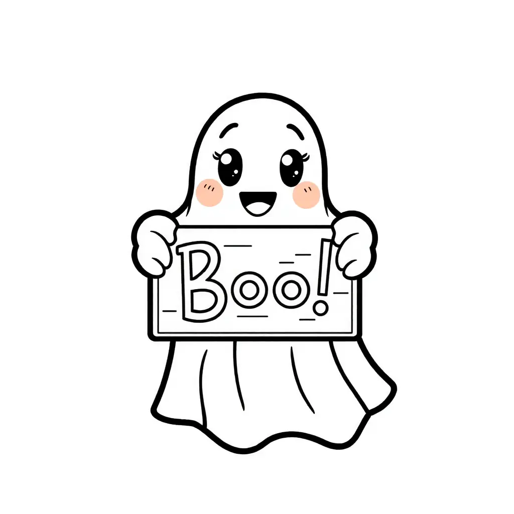Dieses Schwarz-Weiß-Bild zeigt einen Geist, der eine kleine, weiße Schilder mit der Aufschrift "Boo!" hält. Der Geist ist in einer einfachen, klaren Zeichnung dargestellt, die das Ausmalen besonders leicht macht. Die Zeichnung ist in einer einfachen Designweise gehalten, mit wenigen Details und klaren Linien. Der Geist selbst ist von einer hellen, leicht transparenten Farbe gehalten, was ihm einen etwas ätherischen Effekt verleiht.