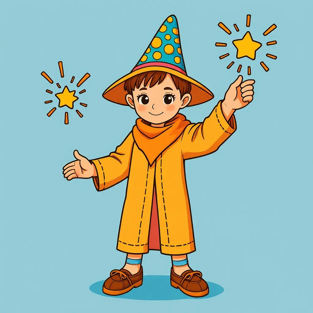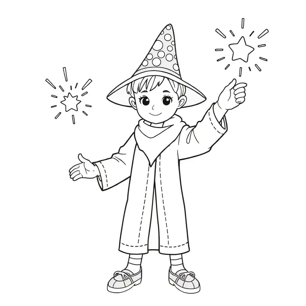 Verkleidetes Kind als Zauberer mit Funkeneffekt als Ausmalbild in Schwarz-Weiß.